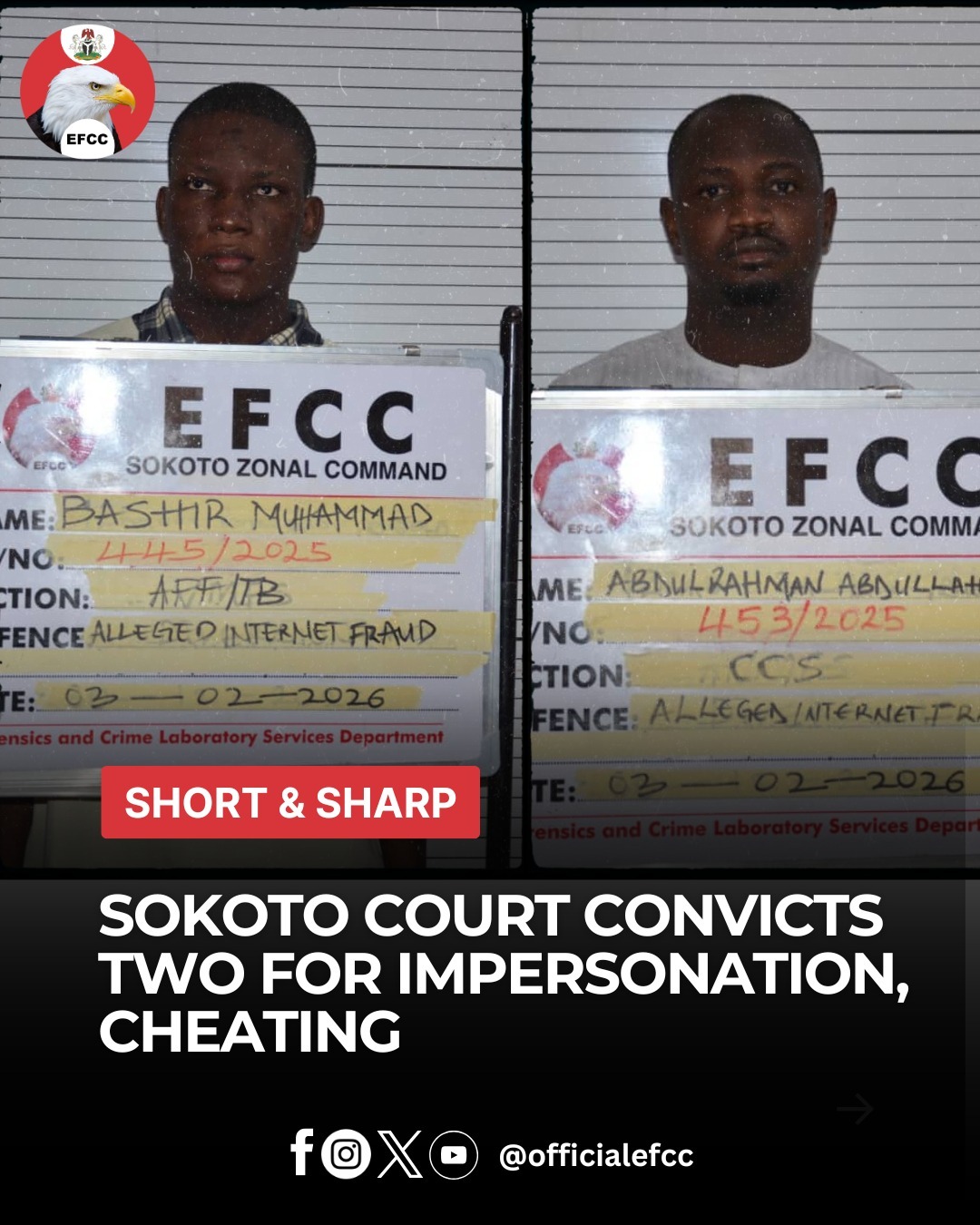 The Sokoto Zonal Directorate of the Economic and Financial Crimes Commission EFCC Tuesday secured the conviction of Abdulrahman Abdullahi (alias A.A Sabo) and Bashir Muhammad over offences or cheating, internet frauds and obtaining by false pretence.